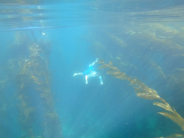 Just short of East Point, when we finally got there, we circled up for a rest. Two of the guys swam with a mask and explored the abalone beds. We jumped in to cool off, wrapped our legs around kelp so we wouldn’t drift away, talked, and fueled up on energy bars and beef jerky. A few harbor seals poked their heads out of the water warily, our only companions.