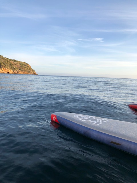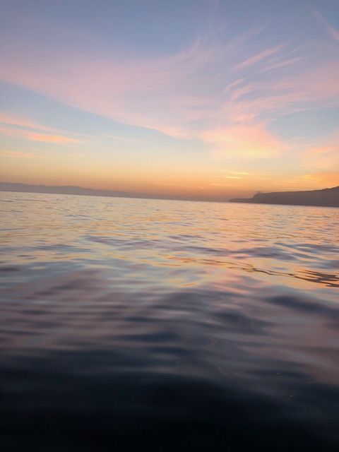 When I woke in my cozy cocoon, I opened up the tiny latched waterproof window in the hull. Peeking out, I could just see brushed pink clouds and an orange sun rising over a perfectly calm ocean. My inflatable board was leashed to the boat, and floated lazily on the water next to my window, occasionally bumping up against the hull.