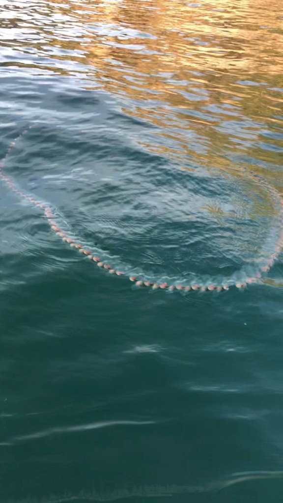 After about fifteen minutes of mid-tempo paddling about 25 yards from shore, I saw a strange object in the corner of my eye. It looked like a long translucent string of plastic bags, each of which had its own small salmon colored fleshy ball in it. The string of bags was approximately fifteen feet long and floating on the surface in a near circle.