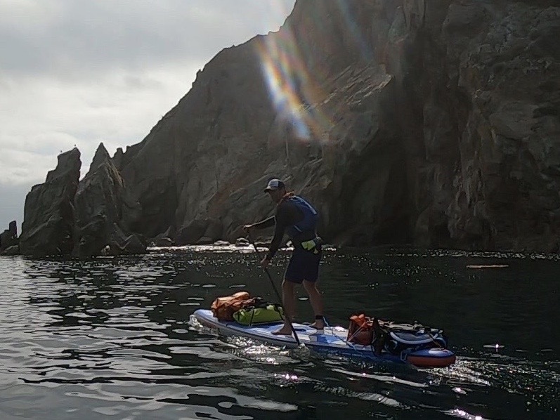 Funny, but it is near impossible to keep five paddlers close together, even in good conditions, and within no time at all, Kenny and I were in the back of the pack, a long way from the other three paddlers in the lead. We paddled purposefully, and slow, remaining in shallow water, and dodging partially submerged rocks as the small waves mingled with the shore. I mostly kept my eyes down, looking for sea life beneath me, hoping to catch sight of a leopard shark, bat ray, or an octopus.