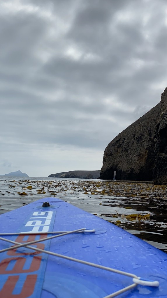 No more than 100 yards from the beach, I encountered a nearly impenetrable kelp patch, which began about fifty yards off shore. But the shore was not a beach; it was a steep, craggy and brown cliff face, jutting straight up overhead about 100 feet or so. For the eager kayakers starting into the water behind me, the kelp was not much of a problem. A kayaker could slide across the top of the kelp bed and dig the paddle into the kelp leaves to help push themselves along. For SUP though, you have a 12 inch fin protruding from the bottom of your board, and the fin acts like a tripwire. You are not going anywhere very fast in thick kelp on SUP, and you might lose your fin completely if it’s not screwed in. My fin was a “snap on” and I didn’t want to risk losing my fin and having to paddle wonky all the way back, fishtailing back and like a moron. So, whenever I encountered kelp, which was often, I weaved my way around the outside of the thickest parts of the patches.