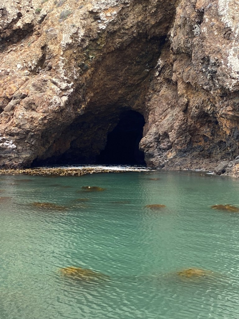 I shot into the water, immediately stood up on the board, and paddled over a small breaking wave. I turned left this time and headed out of Scorpion harbor. Once again, I was immediately confronted with the most amazing sea caves as I traveled down the cliffy coast, one after another. As I had done the day before, I paddled into the ones that were large enough for me, exploring slowly, seeing what I might find. With the sun out, the light penetrated the water, and provided me with a clear view into the water, now turning green in the shallow water near the caves.